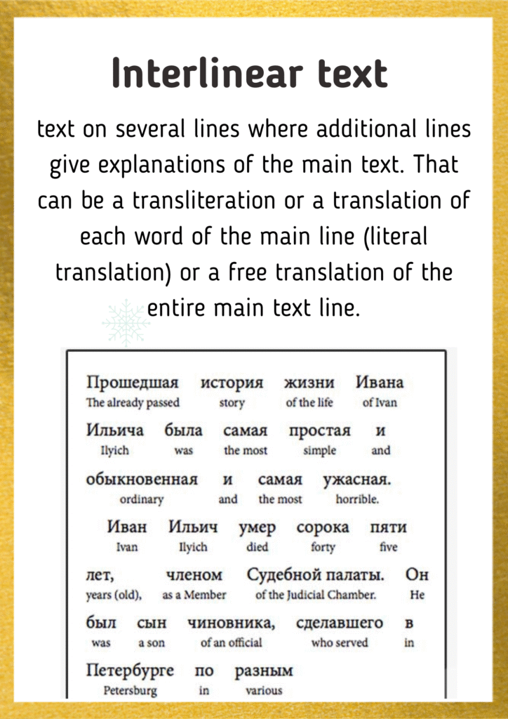 However, there exists a highly effective yet often underestimated method for learning new vocabulary and gaining a deeper understanding of how a language functions. This approach is entirely based on reading and is known as the Interlinear Method of Reading. Although it is not a new technique, it was widely used in the past and continues to be employed for reading biblical texts and learning languages such as Hebrew and Greek. Nevertheless, this method remains relatively unknown today, and there is a limited selection of interlinear books available for learners of Russian.