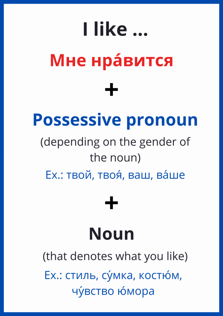 “Мне нравится” + possessive pronoun + noun that denotes what you like.