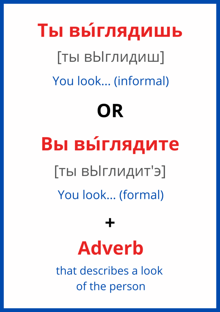 Ты вы́глядишь… or Вы вы́глядите… (You look …) – and then you need to add an adverb that can describe the look of a person.