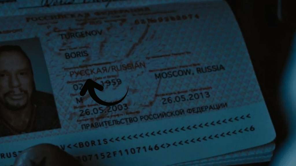 Next comes the movie ‘Iron Man’ where there is again a terrible Russian villain named Boris Turgenov who is in fact … a woman! Just look at his passport, it’s written ‘русская’ which is a feminine form of ‘Russian’.