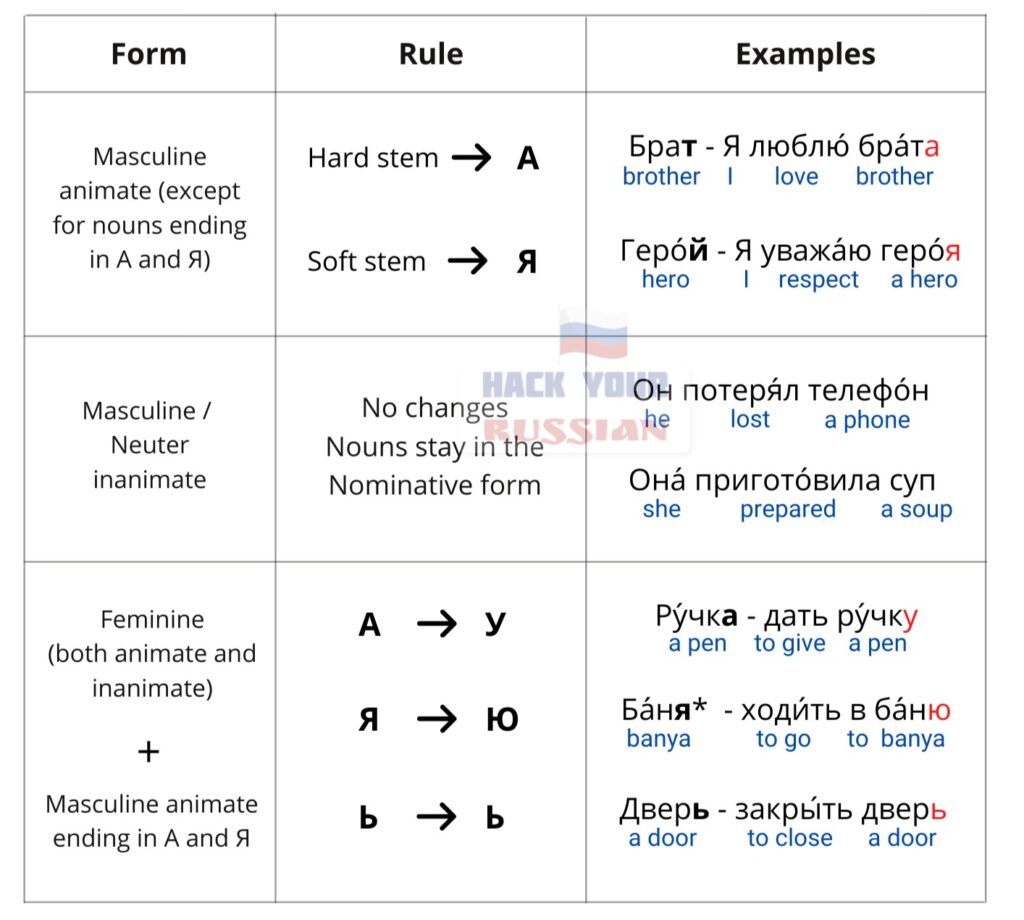 You can find all tables and grammar explanations for the Russian Accusative case in the Most comprehensive guide to the Russian Accusative case.