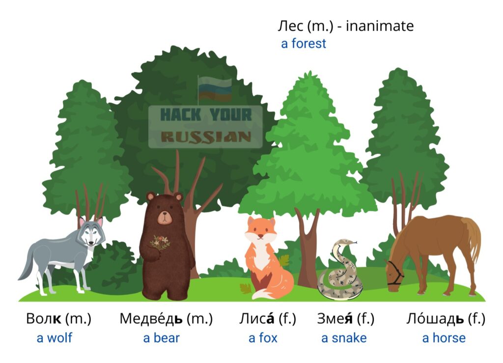 Мы пошли́ в лес и уви́дели там во́лка, медве́дя, лису́, змею́ и ло́шадь (We went to the forest and saw a wolf, a bear, a fox, a snake and a horse there).