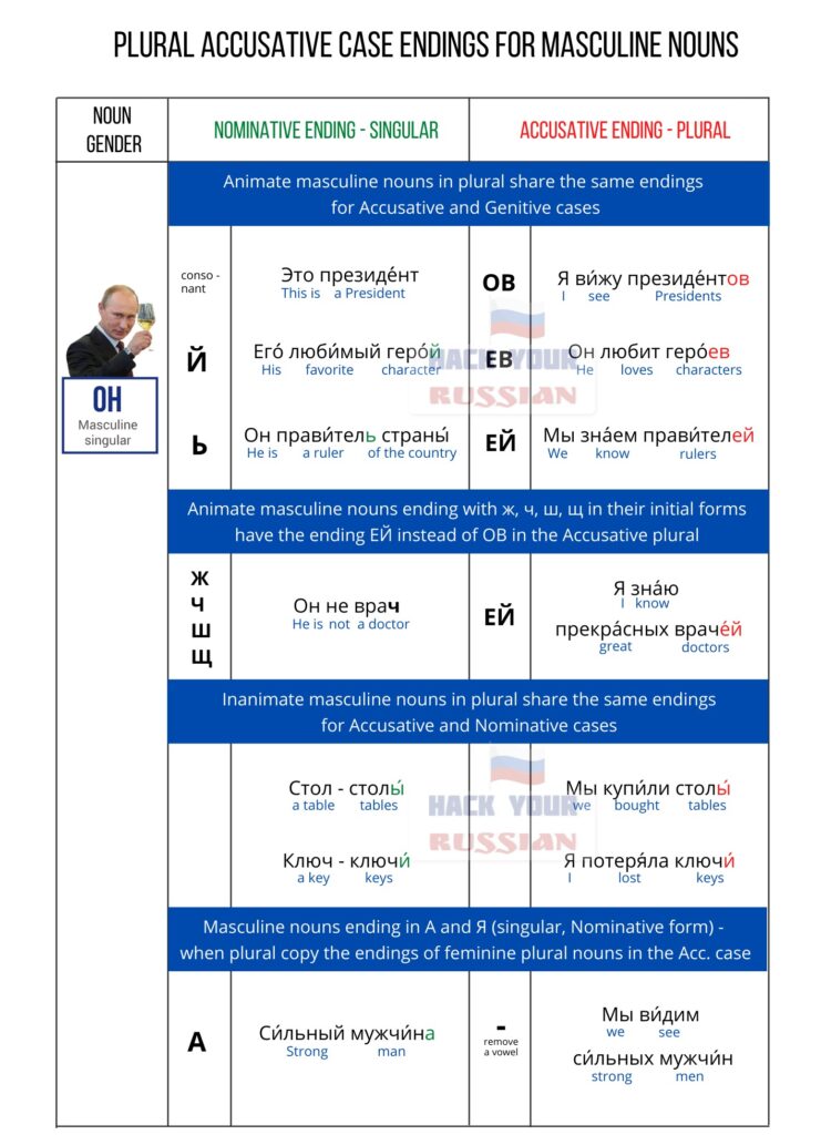 Good news! Only animate plural nouns of any gender change form in the Accusative case (take the same form as in the Genitive case). There is no change for inanimate plural nouns of any gender. But there are also some irregular plural forms of nouns in the Accusative case. Look at the table below.