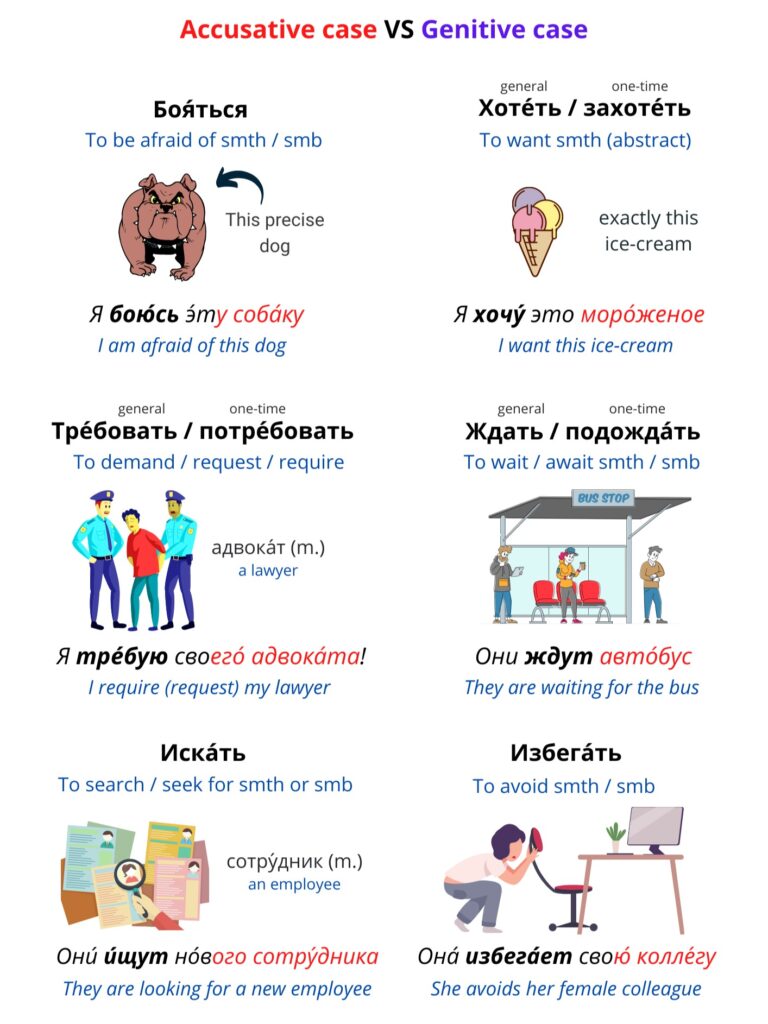 There are also some verbs which are in competition with the Genitive case. In fact, the rule is easy: if you speak about some particular things / people – then use the Accusative case. But overall, even Russian natives make mistakes with these verbs all the time. You can see below such verbs that can be followed either by the Genitive or the Accusative case depending on the context.