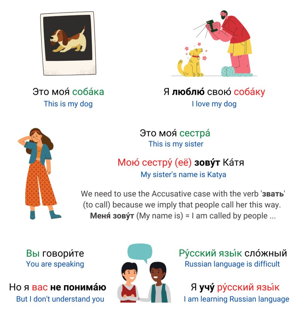 Overall, it becomes clear that these situations share many similarities and are interconnected. The Accusative case is also required with a number of specific prepositions and verbs, which you will encounter throughout this guide. As you can see, there are numerous contexts in which the Accusative case must be used, and therefore, mastering it is essential for developing confident and accurate speech in Russian.