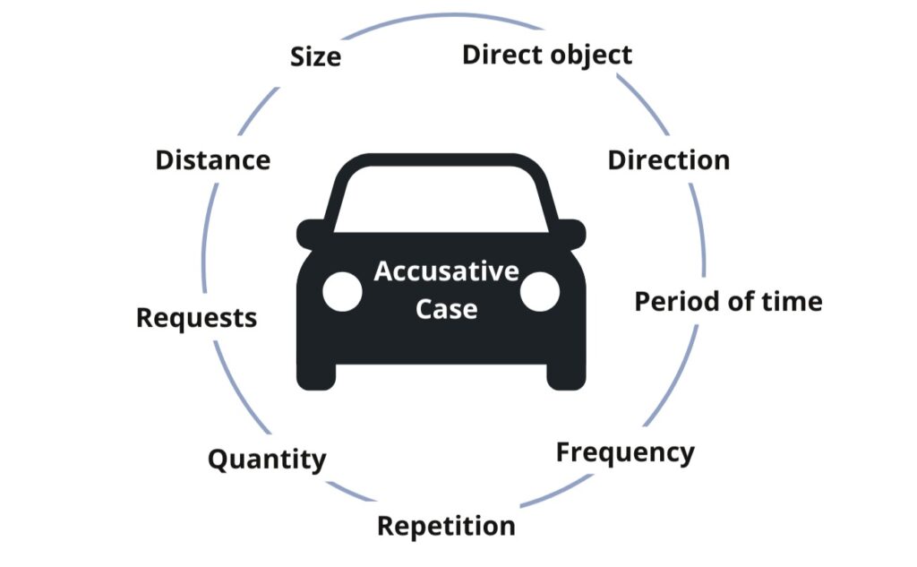 The functions of the Accusative case can be really tricky. To remember them better, you can associate the Accusative case with a car. Just look at the situations when we need to apply it: