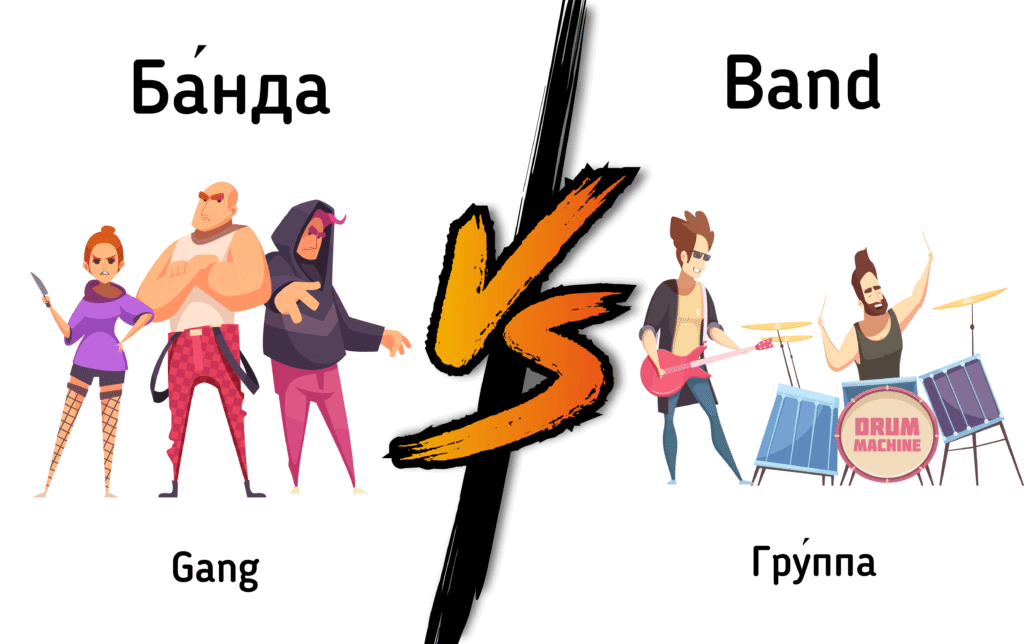 5. Ба́нда [banda] – gang vs Band – гру́ппа [grupa].